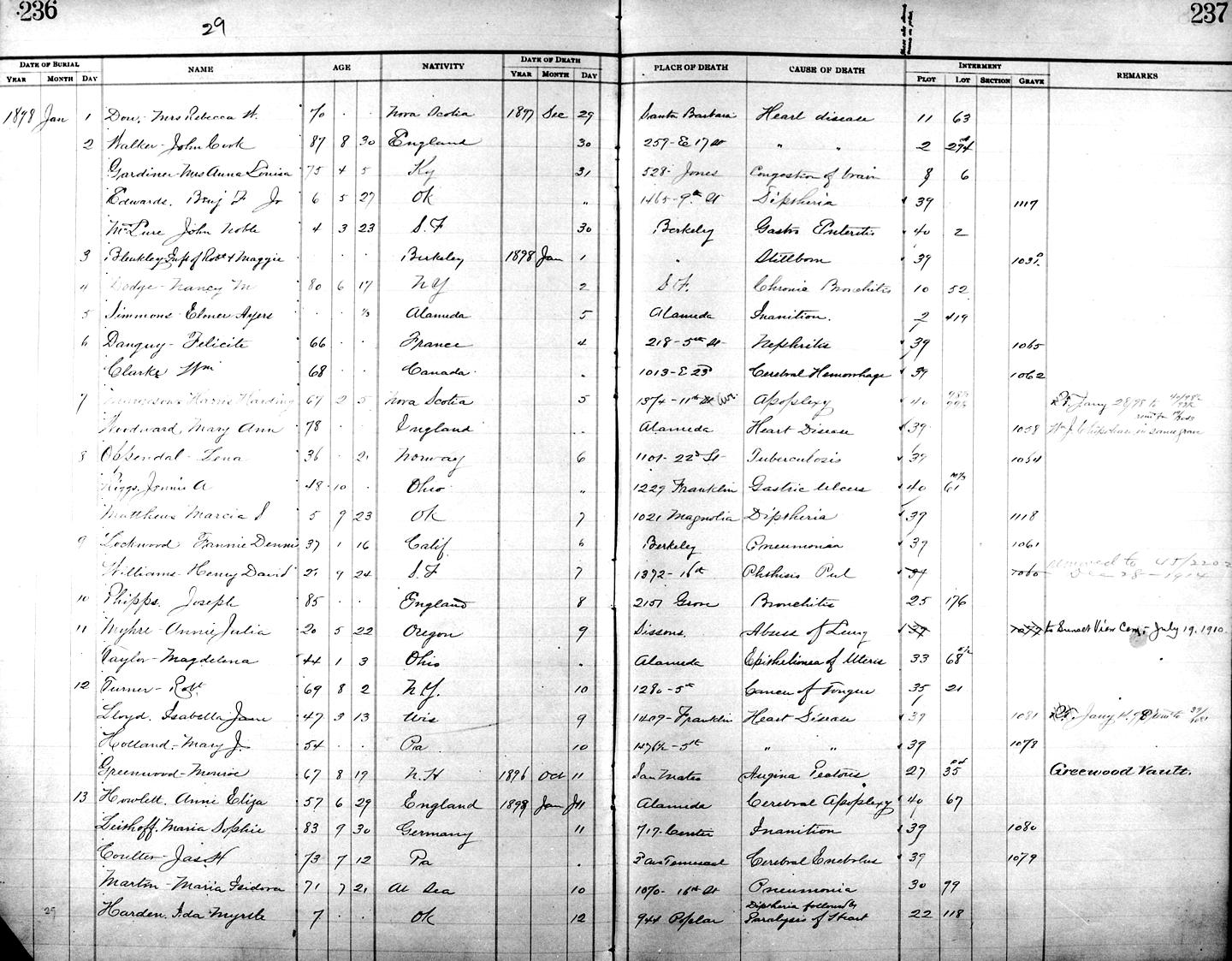 Parents Father: MARGESON, Christopher Mother: DODGE, Susannah Birth Born on October 31, 1830 in Wilmot, Annapolis Co., NS Death Died on January 05, 1898 in Oakland, Alameda Co., CA Buried in Mountain View Cemetery in Oakland, Alameda Co., CA Marriages BAXTER, Charlotte Emily Married on September 03, 1874 in Brooklyn, Alameda Co., CA Children MARGESON, Evaline E.: February 15, 1876 Notes Occupation: Carriage Builder/ Carpenter Death: Apoplexy Sources California Deaths: Oakland Pg. 258 #2492 Images Harris Margeson Death