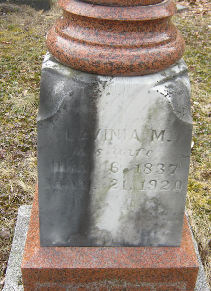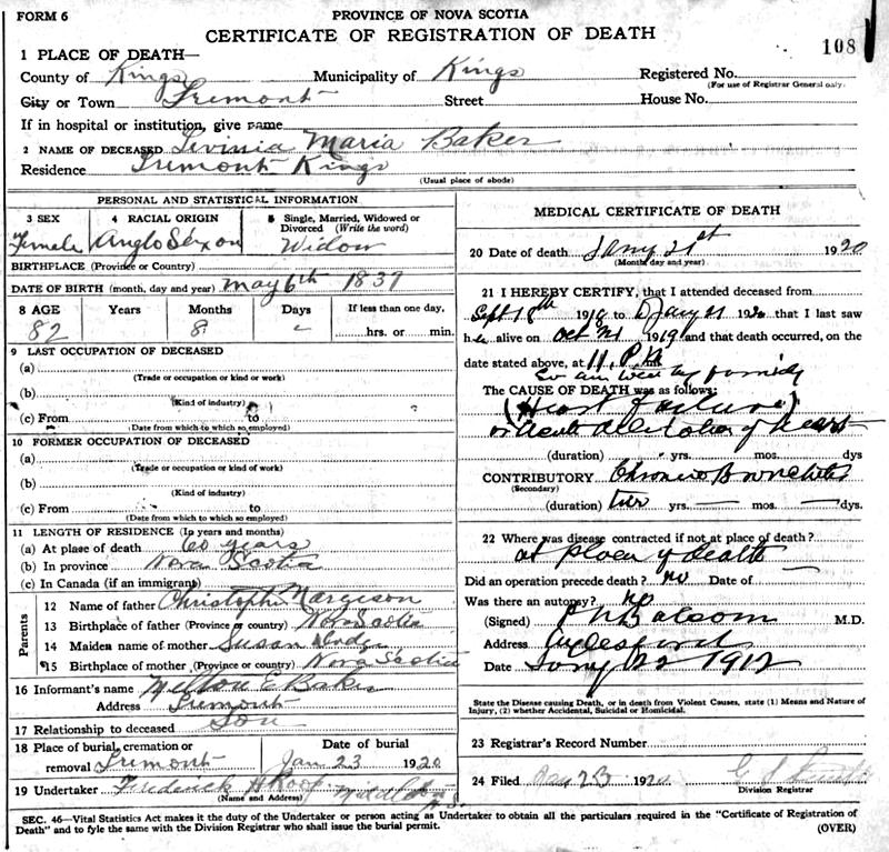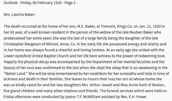 Parents Father: MARGESON, Christopher Mother: DODGE, Susannah Birth Born on May 16, 1837 in Wilmot, Annapolis Co., NS Death Died on January 21, 1920 in Tremont Kings Co., NS Buried in Old Tremont Cemetery in Tremont Kings Co., NS Marriages BAKER, Reuben Reagh Married on 1858 in Aylesford, Kings Co., NS Children BAKER, Ida Susan: March 29, 1859 - May 26, 1915 BAKER, Jessie Alice: 1861 - February 03, 1917 BAKER, Milton Elmore: June 14, 1863 - January 02, 1930 BAKER, Alma Russell: 1867 - December 25, 1955 BAKER, Annie B.: April 27, 1871 - April 17, 1953 BAKER, Henry: May 10, 1871 BAKER, Aubrey Hilborn: May 09, 1879 - January 17, 1902 Notes Death: Heart Failure Sources Nova Scotia Deaths: Year 1921 File 92 #108 Images Lavinia (Margeson) Baker Lavinia (Margeson) Baker Death Lavinia (Margeson) Baker Obit Outlook Middleton,NS Feb 6,1920