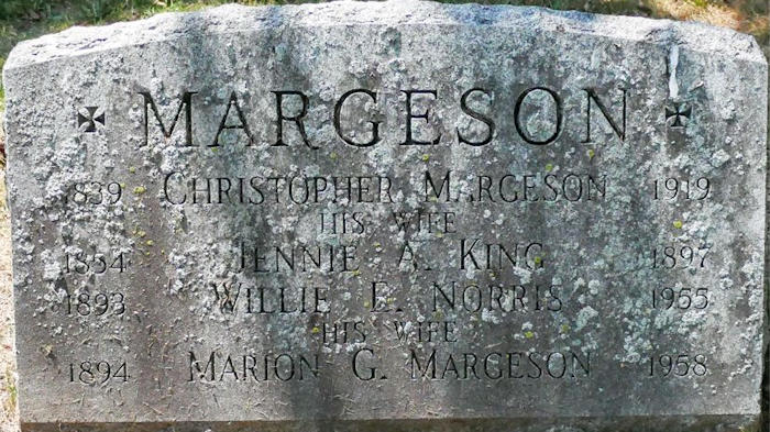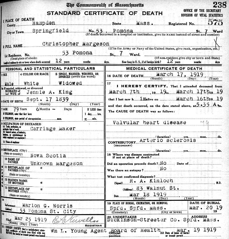 Parents Father: MARGESON, Christopher Mother: DODGE, Susannah Birth Born on September 17, 1839 in Wilmot, Annapolis Co., NS Death Died on March 17, 1919 in Springfield, Hampden Co., MA Buried in Springfield Cemetery in Springfield, Hampden Co., MA Marriages KING, Alice Jennie Married on February 03, 1880 in Springfield, Hampden Co., MA Children MARGESON, Albert Norton: November 25, 1884 - October 12, 1948 MARGESON, Ansley K.: November 01, 1888 MARGESON, Marion Gertrude: June 11, 1894 - March 17, 1958 Notes Occupation: Carriage Maker Death: Valvular Heart Disease Sources Massachusetts Deaths: Springfield Pg. 238 #575 Images Christopher Jr & Alice (King) Margeson,Willie & Marion (Margeson) Norris Christopher Margeson Death Christopher Margeson Marriage