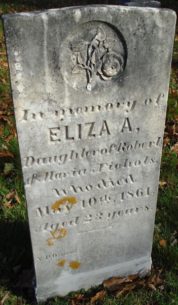 Parents Father: NICHOLS, Robert Mother: DODGE, Maria Birth Born on April 28, 1837 in Nicholsville, Kings Co., NS Death Died on May 10, 1861 in Nicholsville, Kings Co., NS Buried in Aylesford Old United Cemetery in Aylesford, Kings Co., NS Sources Kings Cemetery Records: Aylesford Old United Cemetery Aylesford,NS Images Eliza Nichols