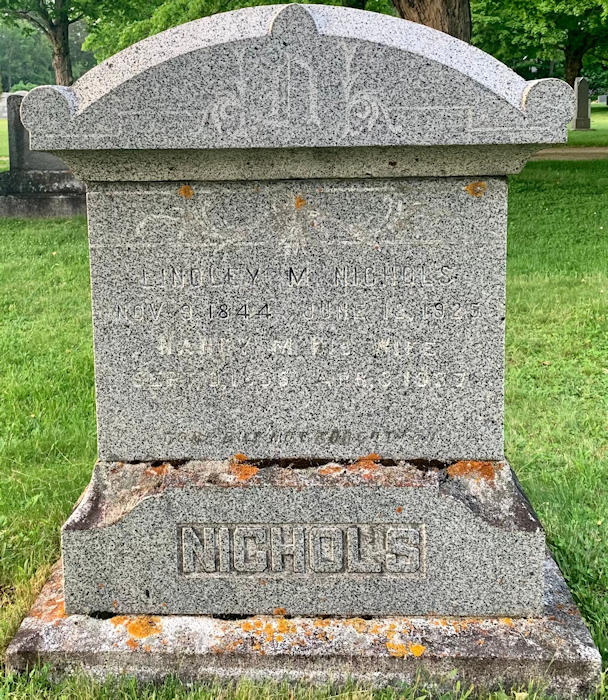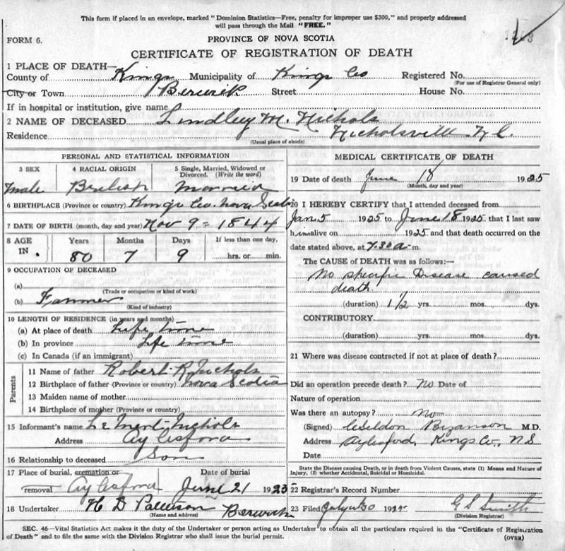 Parents Father: NICHOLS, Robert Mother: DODGE, Maria Birth Born on November 09, 1844 in Nicholsville, Kings Co., NS Death Died on June 18, 1925 in Berwick, Kings Co., NS Buried in Aylesford Union Cemetery in Aylesford, Kings Co., NS Marriages BENT, Nancy M. Married on October 21, 1975 in Morristown, Kings Co., NS Children NICHOLS, Martha Odessa: August 22, 1876 - June 11, 1974 NICHOLS, Elmore: 1879 - June 25, 1980 NICHOLS, Naomi Elizabeth: April 05, 1881 - June 10, 1927 NICHOLS, Lola Maude: February 14, 1883 - July 26, 1972 NICHOLS, William Lamert: September 02, 1885 - February 25, 1962 NICHOLS, Fannie Louise: March 04, 1886 - November 22, 1963 NICHOLS, Morley Puncheon: July 06, 1888 - February 18, 1953 Notes Occupation: Farmer Sources Nova Scotia Deaths: Year 1925 File 93 #1203 Images Lindley & Nancy (Bent) Nichols Lindley Nichols Death Lindley Nichols Marriage