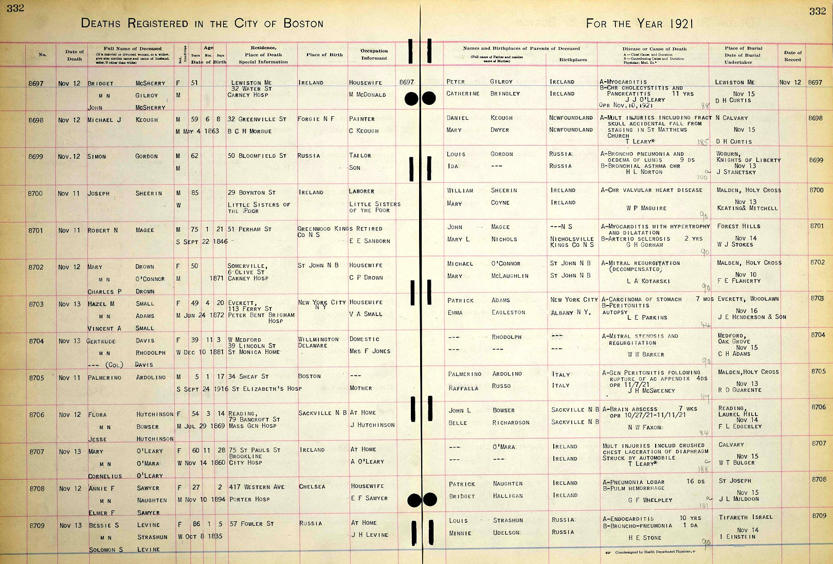 Parents Father: MAGEE, John Mother: NICHOLS, Mary Elizabeth Birth Born on September 22, 1846 in Greenwood, Kings Co., NS Death Died on November 11, 1921 in Boston, Suffolk Co., MA Buried in Forest Hills Cemetery in Jamaica Plain, Suffolk Co., MA Notes Occupation: Driver Death: Myocarditis/ Hypertrophy/ Dilatation Sources Massachusetts Deaths: Boston Deaths 1921 Pg. 332 #8701 Images Robert Magee Death Robert Magee Naturalization