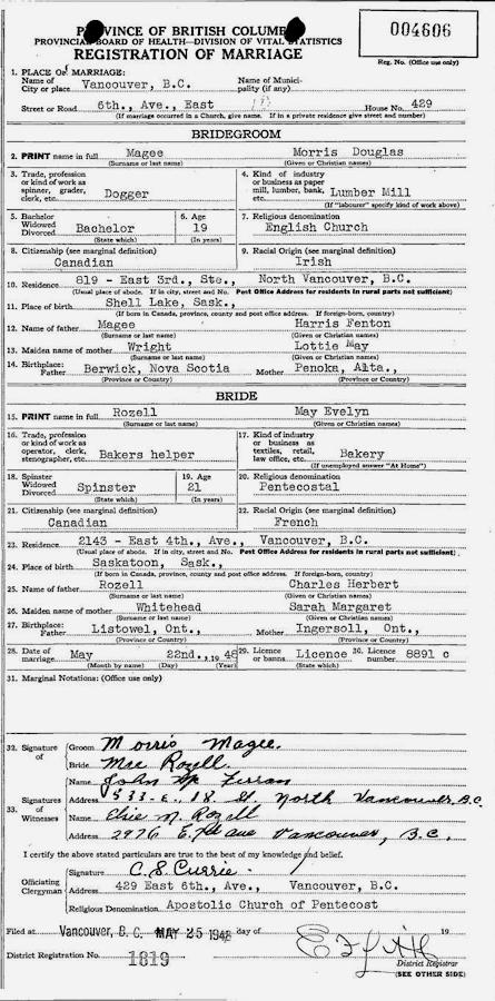 Parents Father: MAGEE, Harris Fenton Mother: WRIGHT, Lottie May Birth Born on September 15, 1928 in Shell Lake, North Battleford Census Division, SK Death Died on August 10, 2000 in Penticton, Okanagan-Similkameen Region, BC Buried in Lakeview Cemetery in Penticton, Okanagan-Similkameen Region, BC Marriages ROZELL, May Evelyn Married on May 22, 1948 in Vancouver, Metro Vancouver Region, BC Children MAGEE, Colleen MAGEE, Karen MAGEE, Donald MAGEE, Earl: 1949 - September 01, 2012 MAGEE, Carol Mae: April 25, 1951 - September 21, 2018 Notes Occupation: Dogger Lumber Mill Sources Mormons: https://www.familysearch.org/tree/person/details/LFCH-RYW Images Morris Magee Marriage