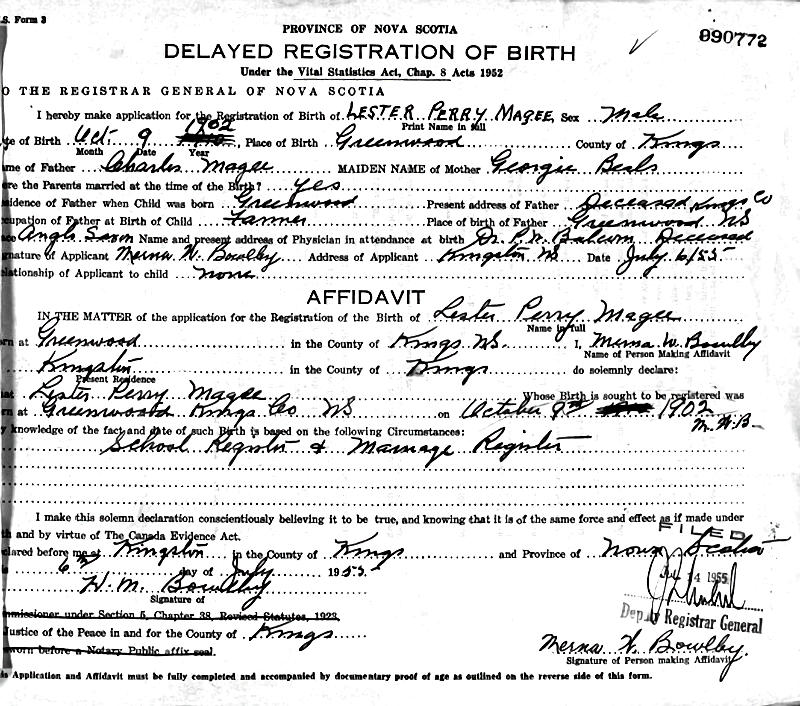 Parents Father: MAGEE, Charles Wesley Mother: BEALS, Georgie May Birth Born on October 09, 1902 in Greenwood, Kings Co., NS Death Died on September 30, 1978 in Kings Co., NS Buried in North Kingston Cemetery in North Kingston, Kings Co., NS Marriages MARSHALL, Jennie Olive Odessa Married on January 21, 1925 in Kingston, Kings Co., NS Children MAGEE, Cyril Eugene: 1925 - 1988 MAGEE, Thelma Ardena: 1929 - July 28, 2014 MAGEE, Carroll Marshall: 1931 - 1998 MAGEE, Bertwell Charles: September 12, 1932 - September 09, 2021 MAGEE, Lester Wayne: June 02, 1940 - February 09, 1943 MAGEE, Byron Robert: June 07, 1946 - March 20, 2013 Notes Occupation: Farmer Sources Findagrave.com: https://www.findagrave.com/memorial/164028703/lester_perry-magee Images Lester Magee Birth Lester & Jennie (Marshall) Magee Lester Magee Marriage