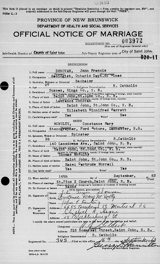 Parents Father: McNULTY, Thomas Gerald Mother: MORRELL, Hazel Gertrude Birth Born on May 30, 1935 in Saint John, Saint John Co., NB Death Died on September 04, 2001 in Winona, Winona Co., MN Buried in Saint Marys Cemetery in Winona, Winona Co., MN Marriages DONOVAN, John Francis Married on September 14, 1963 in Saint John, Saint John Co., NB Sources Minnesota Deaths: #2001-MN-525973 Images Constance (McNulty) Donovan Constance McNulty Marriage
