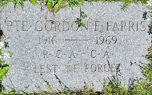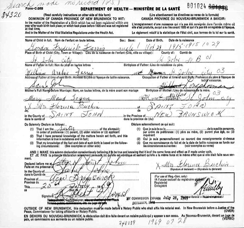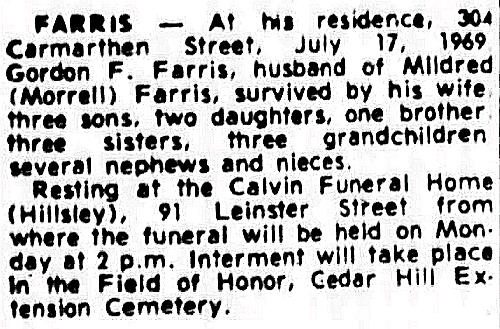 Birth Born on October 29, 1915 in Saint John, Saint John Co., NB Death Died on July 17, 1969 in Saint John, Saint John Co., NB Buried in Cedar Hill Extension Cemetery in Saint John, Saint John Co., NB Marriages MORRELL, Mildred Foster Bernice Married on May 04, 1934 in Saint John, Saint John Co., NB Notes Occupation: Grocery Store Clerk/ Longshoreman Military Service: WW2 RC Army Death: Acute Coronary Insuffienciency Sources NB Deaths: #3495 Images Gordon Farris Birth Gordon Farris Gordon Farris Death Mildred Morrell Marriage Gordon Farris Obit