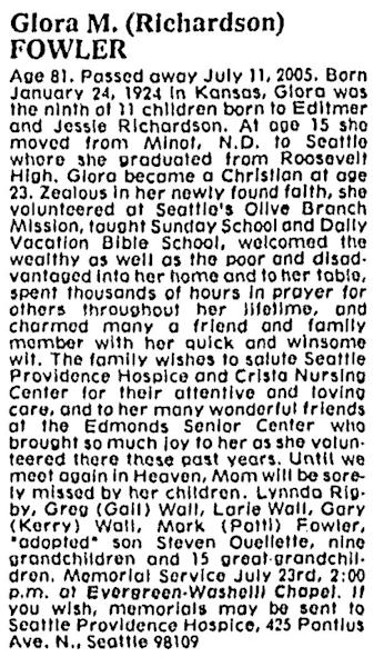 Birth Born on January 24, 1924 in Summerfield, Marshall Co., KS Death Died on July 11, 2005 in Seattle, King Co., WA Buried in Evergreen-Washelli Memorial Park in Seattle, King Co., WA Marriages FOWLER, Robert Auld Married on July 28, 1957 in Indianola, Kitsap Co., WA Children FOWLER, Mark Sources US Social Security Index: Numerical ID Files Images Glora (Wall) Fowler Robert Fowler Marriage License Glora (Wall) Fowler Obit Seattle Post-Intelligencer Seattle,WA July 19,2005 Glora (Richardson) Wall