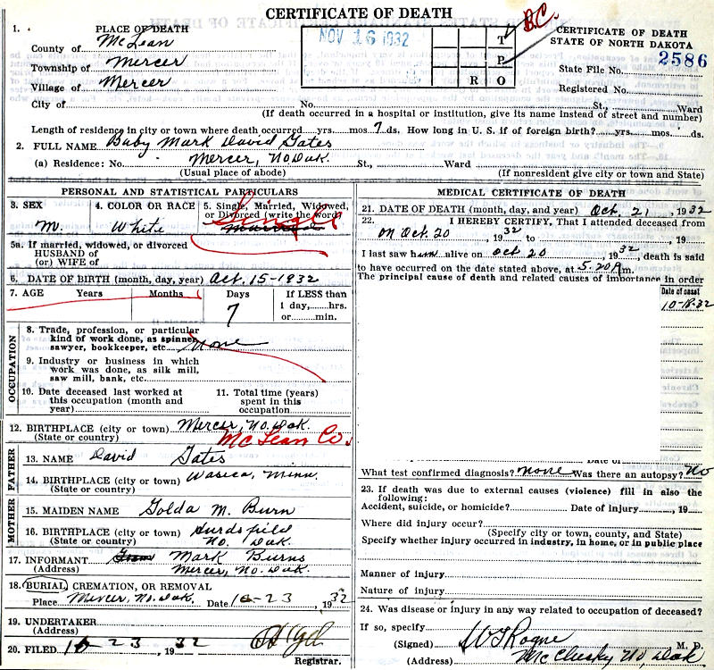 Parents Father: GATES, David Mother: BURNS, Golda Mae Birth Born on October 15, 1932 in Mercer, McLean Co., ND Death Died on October 21, 1932 in Mercer, McLean Co., ND Buried in Mercer Hillside Cemetery in Mercer, McLean Co., ND Marriages , Sources North Dakota Deaths: #2586 Images Mark Gates Death