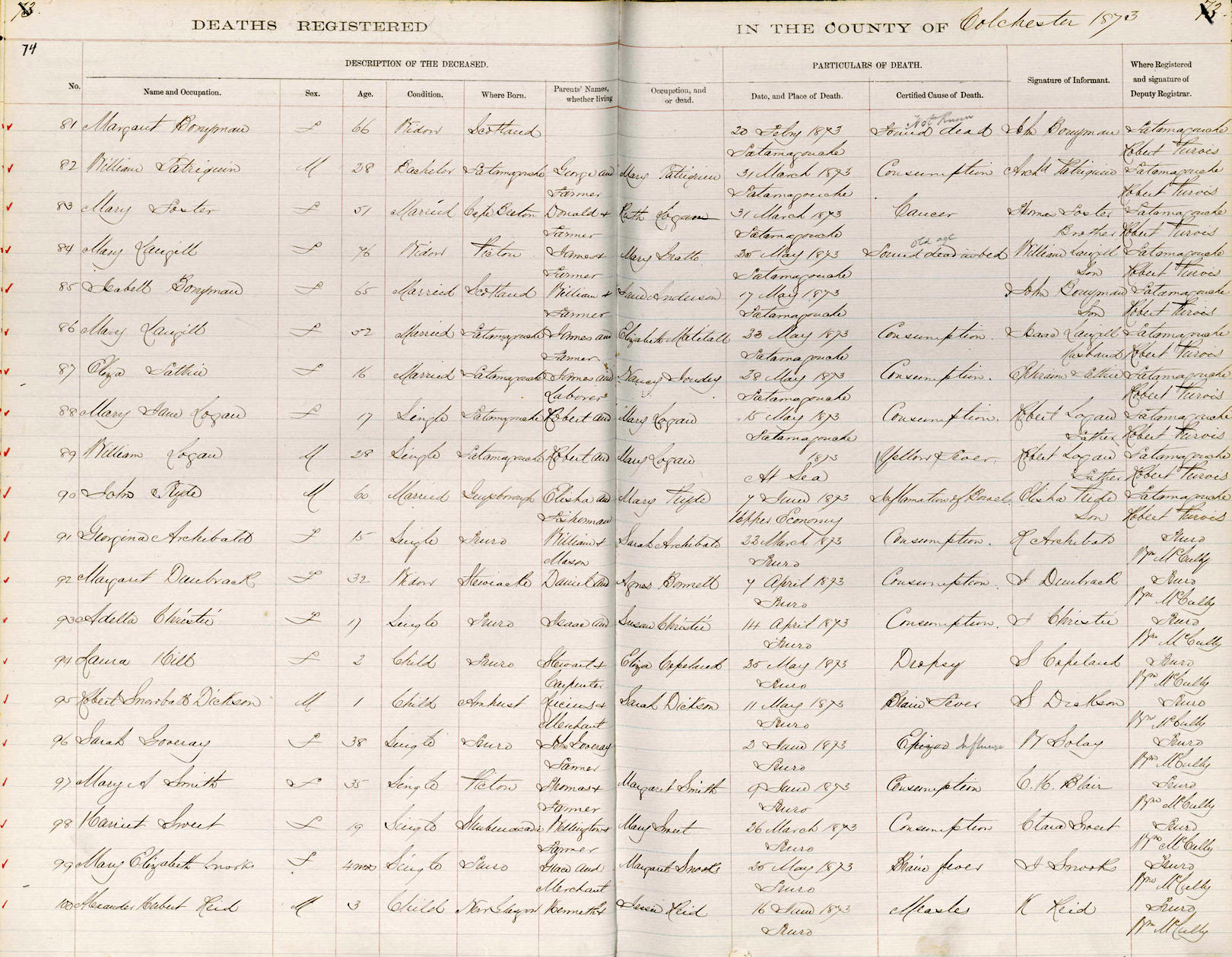 Parents Father: JOUDREY, James Mother: BIGNEY, Nancy Agnes Birth Born on 1843 in Tatamagouche, Colchester Co., NS Death Died on May 28, 1873 in Tatamagouche, Colchester Co., NS Marriages TATTRIE, Ephraim Married on September 02, 1869 in Tatamagouche, Colchester Co., NS Children TATTRIE, Annie Nettie: November 09, 1868 - October 05, 1943 TATTRIE, Lemuel: October 17, 1871 - May 20, 1959 Notes Death: Consumption Sources Nova Scotia Deaths: Book 1804 Pg. 74 #87 Images Elizabeth (Joudrey) Tattrie Death Ephraim Tattrie Marriage