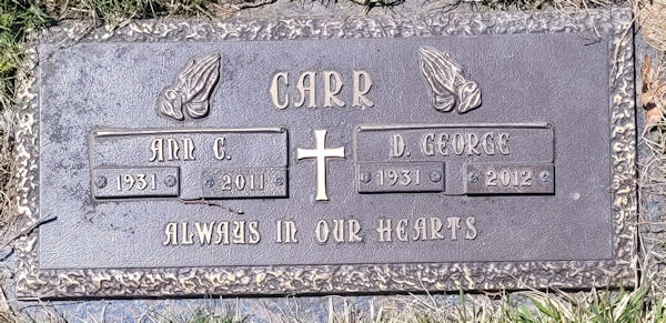 Birth Born on 1931 in Geary, Sunbury Co., NB Death Died on October 27, 2012 in Burlington, Halton Region, ON Buried in Gate of Heaven Catholic Cemetery in Burlington, Halton Region, ON Marriages WALSH, Anna Celestine Married on April 29, 1950 in West Saint John, Saint John Co., NB Children CARR, Jacqueline CARR, David CARR, Victor Notes Occupation: Supervisor Stelco Obituary: Carr, Dorus Gilford (George) Peacefully at Joseph Brant Memorial Hospital, Burlington, with his family at his side on Saturday, October 27, 2012 in his 82nd year. Beloved husband and best friend of the late Anna Carr (2011). Loving father of Jacqueline Carr Granger, David and his wife Lynn and Victor. Loving papa of Jeffrey Granger, Marvin, Tammy, Jason, Kristine, Emily Carr, and great-papa of Caleb Granger, Cori and Kira Carr. Dear brother of Glen Carr and his wife Juanita and his sister Audrey Nichols, and brother-in-law of Ronald Walsh and his wife Renee, Stephen Walsh and his wife Olive, Stuart Walsh and his wife Vivian. Predeceased by his sister Arlene McLellan and by his brothers Everette and Garth. He will be sadly missed by his many nieces and nephews. George was a retiree from Stelco, having worked as a supervisor for 34 years. A special thank you to the hospital staff on 5 South for their compassionate care given to George. Visitation at SMITH'S FUNERAL HOME, 1167 Guelph Line (one stoplight north of QEW), BURLINGTON (905-632-3333), on Tuesday from 3-5 and 7-9 p.m. where Funeral Prayers will be held in the Chapel on Wednesday, October 31, 2012 at 1 p.m. Interment Gate of Heaven Cemetery, Burlington. Reception to follow at the funeral home. For those who wish, donations made in memory of George to the charity of your choice would be sincerely appreciated by the family. Sources Funeral Home: Smith's Funeral Home,Burlington,ON Obituary October 2012 Images Anna Walsh Marriage Dorus & Anna (Walsh) Carr