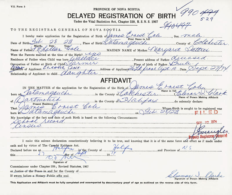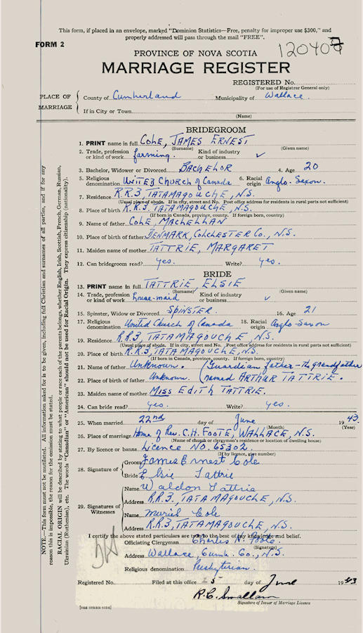 Parents Father: COLE, MacLellan W. Mother: TATTRIE, Margaret Clark Birth Born on February 28, 1923 in Tatamagouche, Colchester Co., NS Death Died on June 13, 2005 in Tatamagouche, Colchester Co., NS Buried in Lockerby Memorial Cemetery in Tatamagouche, Colchester Co., NS Marriages TATTRIE, Laurie Elsie Married on June 22, 1943 in Wallace, Cumberland Co., NS Children COLE, Eleanor COLE, Wendell Cecil: September 22, 1948 - March 06, 2025 Notes Occupation: Farmer/ Woodsman/ Carpenter Obituary: COLE, J. Ernest - 82, Tatamagouche, passed away peacefully at his home on June 13, 2005, surrounded by his wife and family. Born in Richmond, Cumberland Co., he was a son of the late MacLellan ""Mac"" and Margaret (Tattrie) Cole. Ernie lived in the Tatamagouche area where he worked in the woods and later became a well-known carpenter. He is survived by his wife of 61 years, the former Elsie Tattrie; daughter, Eleanor Clark (Bill), Comox, B.C.; son, Wendell (Janet), Tatamagouche; grandchildren, Shelley, Scott, Coralee (Joe), Terry (Julie), Sandy; greatgrandchildren, Bailey, Bryanna, Braycen; sisters, Muriel Hillier (Gordon), Tatamagouche; Phyllis Sutherland (Bill), Calgary; brother, Willis (Marion), Tatamagouche; several nieces and nephews. Visitation will be today from 2-4 and 7-9 p.m. with funeral service Wednesday at 2 p.m., Rev. Bonnie Kelly officiating, both in Coulter's Funeral Home, Tatamagouche. Interment to take place in Lockerby Memorial Cemetery, Tatamagouche. Family flowers only. Memorial donations to the Canadian Cancer Society, North Shore Health Services Foundation or any charity would be appreciated. Sources Funeral Home: Coulter's Funeral Home Tatamagouche,NS Obituary June 2005 Images James Cole Birth James & Laurie (Tattrie) Cole James Cole Marriage