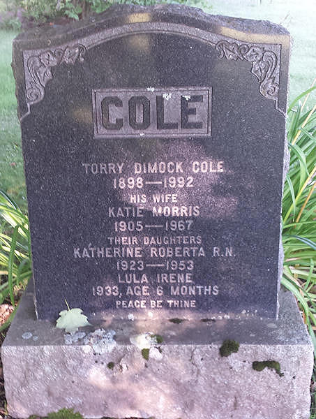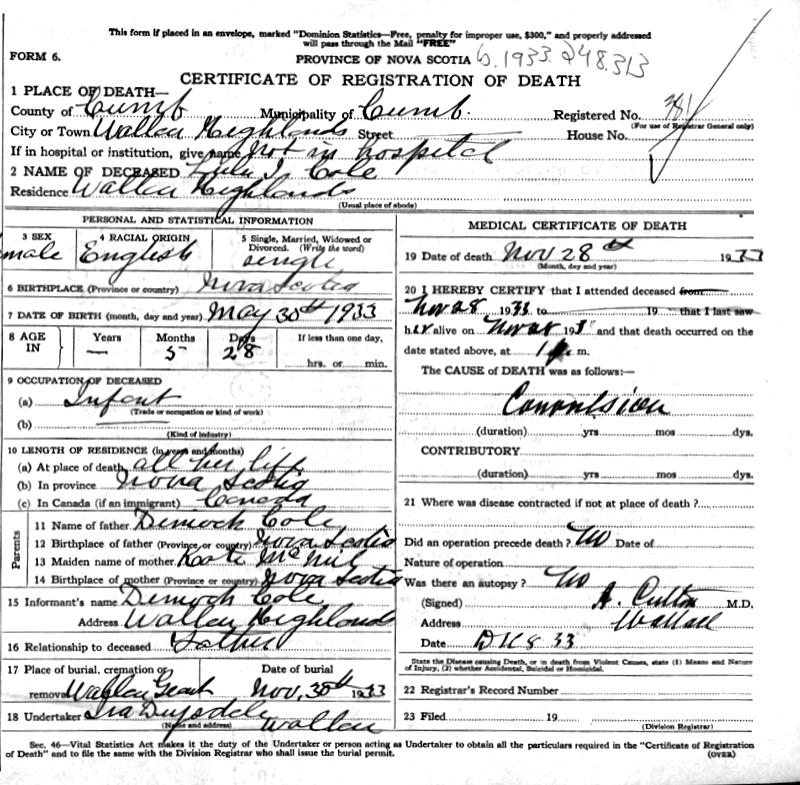 Parents Father: COLE, Dimock Torry Mother: McNEIL, Katherine Morris Birth Born on May 30, 1933 in Wallace Highlands, Cumberland Co., NS Death Died on November 28, 1933 in Wallace Highlands, Cumberland Co., NS Buried in Monument Hill Cemetery in Wallace Grant, Cumberland Co., NS Sources Nova Scotia Deaths: Year 1933 File 159 #381 Images Dimock & Catherine (McNeil) Cole,Katherine & Lula Cole Lula Cole Death