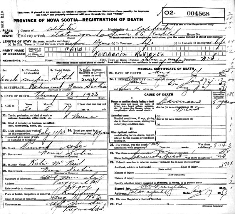 Parents Father: COLE, Dimock Torry Mother: McNEIL, Katherine Morris Birth Born on February 28, 1923 in Wallace Highlands, Cumberland Co., NS Death Died on August 14, 1953 in Tatamagouche, Colchester Co., NS Buried in Monument Hill Cemetery in Wallace Grant, Cumberland Co., NS Notes Occupation: Registered Nurse Death: Carcinoma of Breast Sources Nova Scotia Deaths: Year 1953 #4568 Images Katherine Cole Birth Dimock & Catherine (McNeil) Cole,Katherine & Lula Cole Katherine Cole Death