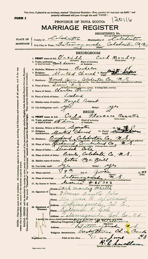 Birth Born on 1925 in Truro, Colchester Co., NS Death Died on 2011 Buried in Sunny Brae Cemetery in Oliver, Colchester Co., NS Marriages COLE, Florence Annetta Married on June 09, 1943 in Tatamagouche, Colchester Co., NS Children O'NEIL, Floyd Carman: August 15, 1943 - November 19, 1943 Notes Occupation: Rural Mail Carrier Sources Colchester Cemeteries: Sunny Brae Cemetery Oliver,NS Images Carl & Florence (Cole) & Floyd O'Neil Florence Cole Marriage
