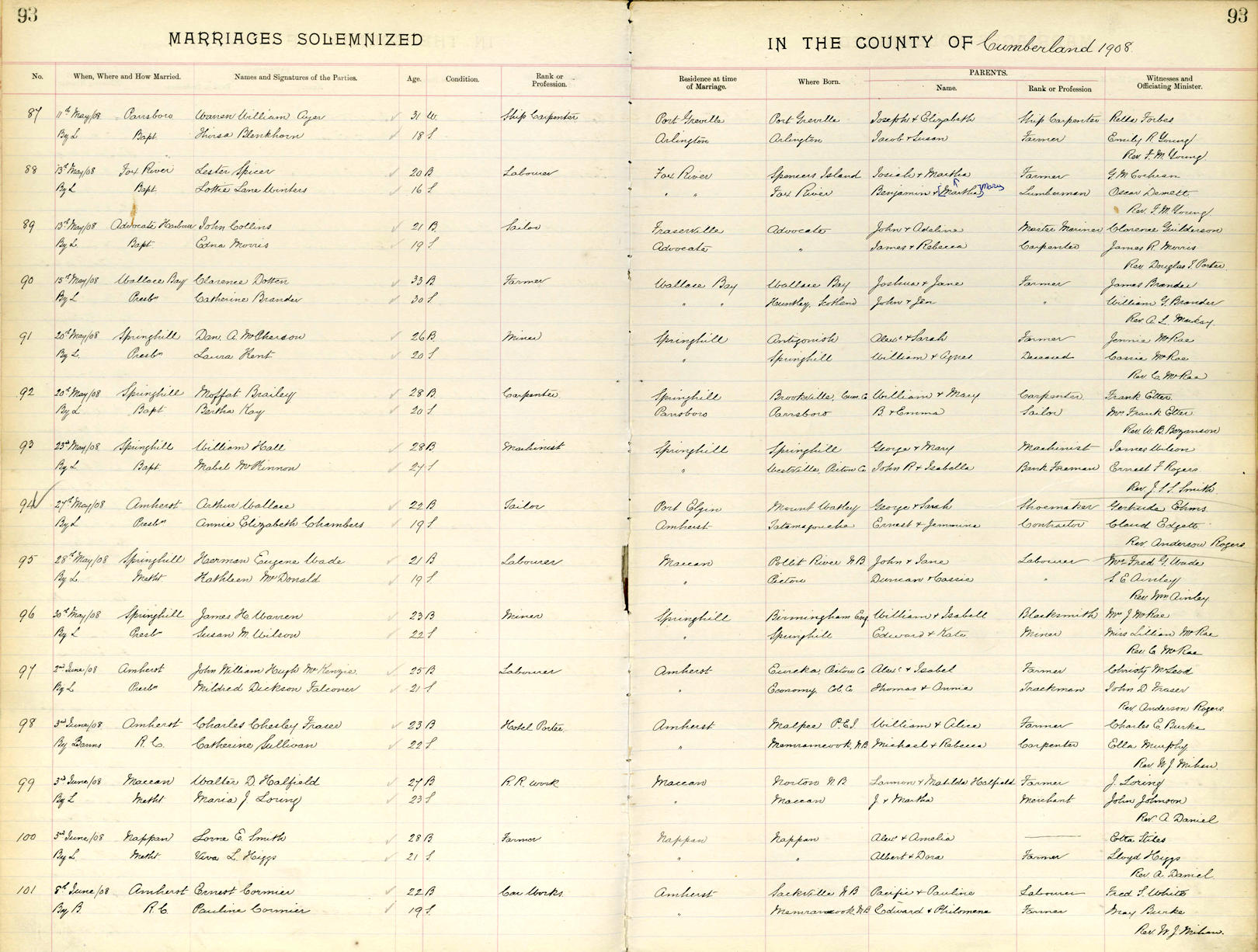 Birth Born on 1884 in Mount Whatley, Westmorland Co., NB Death Died on 1920 in Bristol, Hartford Co., CT Marriages CHAMBERS, Annie Elizabeth Married on May 27, 1908 in Amherst, Cumberland Co., NS Children WALLACE, Eva Vera: February 19, 1909 - August 03, 2010 WALLACE, George Ernest: August 06, 1910 - October 10, 2004 WALLACE, Boy: September 09, 1912 - September 09, 1912 WALLACE, Hazel Margaret: April 28, 1914 - October 07, 2005 WALLACE, Robert Bruce: May 28, 1919 - February 06, 1978 WALLACE, Arthur Wilbur: July 28, 1922 - October 16, 1985 Notes Occupation: Tailor Images Annie Chambers Marriage