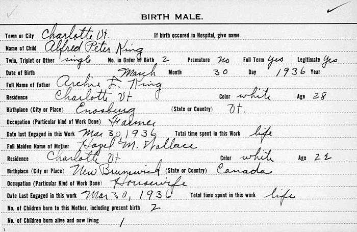 Parents Father: KING, Archie Lawrence Mother: WALLACE, Hazel Margaret Birth Born on March 30, 1936 in Charlotte, Chittenden Co., VT Marriages FOLCIK, Patricia B. Images Alfred King Birth