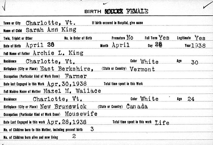 Parents Father: KING, Archie Lawrence Mother: WALLACE, Hazel Margaret Birth Born on April 28, 1938 in Charlotte, Chittenden Co., VT Images Sarah King Birth