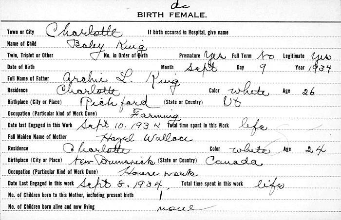 Parents Father: KING, Archie Lawrence Mother: WALLACE, Hazel Margaret Birth Born on September 09, 1934 in Charlotte, Chittenden Co., VT Death Died on September 09, 1934 in Charlotte, Chittenden Co., VT Notes Death: Stillborn Images Girl King Birth Girl King Death