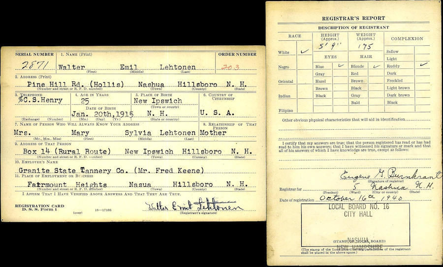Birth Born on January 20, 1915 in New Ipswich, Hillsborough Co., NH Death Died on June 06, 2000 in Bristol, Hartford Co., CT Buried in Smithville Cemetery in New Ipswich Center, NH Marriages WALLACE, Hazel Margaret Married on July 19, 1971 in Bristol, Hartford Co., CT Notes Occupation: Employee at Granite State Tannery Co/ Farm Labourer/.Caretaker Military Service: WW2 US Army Sources Connecticut Deaths: #11856 Images Walter Lehtonen Walter Lehtonen WW2 Draft