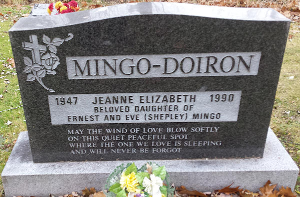Parents Father: MINGO, Ernest Chambers Mother: SHEPLEY, Eva Helen Birth Born on 1947 in New Glasgow, Pictou Co., NS Death Died on 1990 Buried in Holy Trinity Anglican Church Cemetery in Middleton Corner, Colchester Co., NS Sources Colchester Cemeteries: Holy Trinity Anglican Church Cemetery Middleton Corner,NS Images Jeanne (Mingo) Doiron