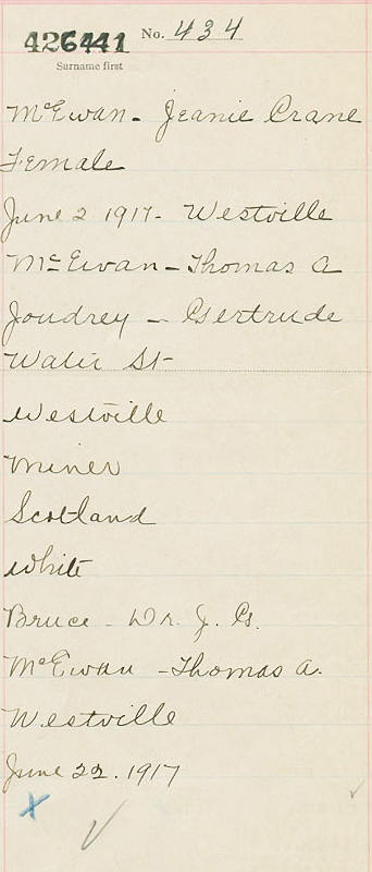 Parents Father: MACEWAN, Thomas A. Mother: JOUDRIE, Gertrude Birth Born on June 02, 1917 in Westville, Pictou Co., NS Death Died on July 13, 2003 in Ottawa, National Capital Region, ON Marriages MACDONALD, Josiah duncan Married on August 11, 1942 in Sydney, Cape Breton Co., NS Notes Occupation: Teacher Sources Mormons: https://www.familysearch.org/en/tree/person/details/GTWC-2Z6 Images Jean MacEwan Birth Jean MacEwan Marriage