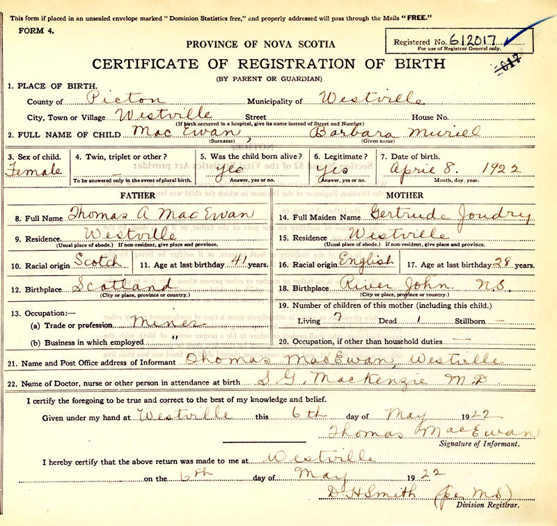 Parents Father: MACEWAN, Thomas A. Mother: JOUDRIE, Gertrude Birth Born on April 08, 1922 in Westville, Pictou Co., NS Death Died on December 16, 2004 in Pictou, Pictou Co., NS Buried in Haliburton Cemetery in Haliburton, Pictou Co., NS Marriages GOLLAN, George Ballem Married on November 10, 1944 in Pictou, Pictou Co., NS Notes Occupation: Office Clerk T. Eaton Co. Sources Mormons: https://www.familysearch.org/en/tree/person/details/GTWC-RS4 Images Barbara MacEwan Birth George & Barbara (MacEwan) Gollan Barbara MacEwan Marriage