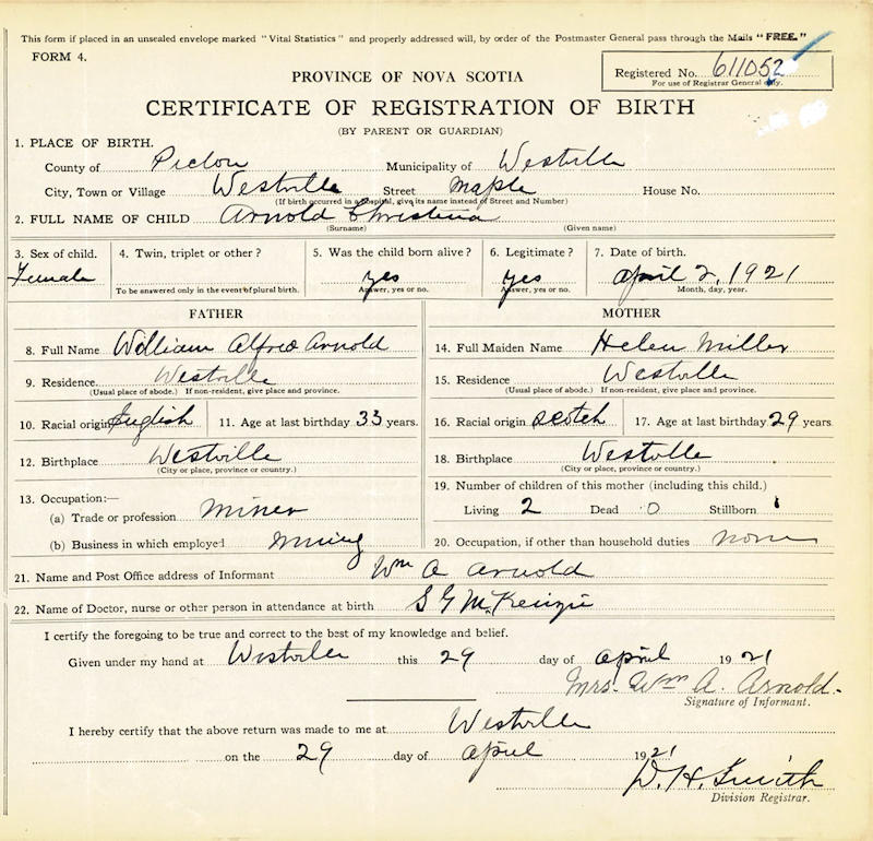 Birth Born on April 02, 1921 in Westville, Pictou Co., NS Death Died on 1998 in Pictou Co., NS Buried in St. Bee's Cemetery Westville,NS in Westville, Pictou Co., NS Marriages MACEWAN, Harry Married on April 09, 1938 in Westville, Pictou Co., NS Children MACEWAN, John Robert: 1941 - 1963 Sources Pictou Cemetery Records: St. Bee's Cemetery Westville,NS Images Christine Arnold Birth Harry & Christine (Arnold) & John MacEwan Harry MacEwan Marriage