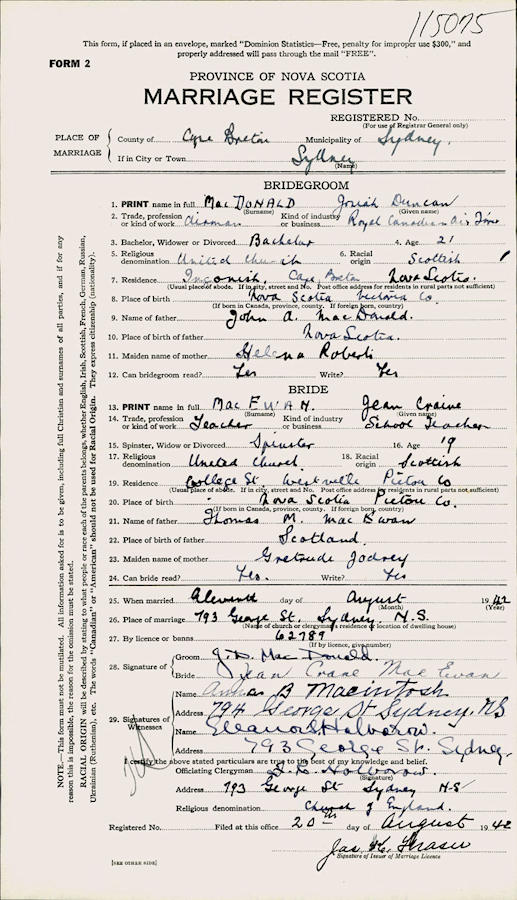 Birth Born on November 03, 1920 in Ingonish, Victoria Co., NS Marriages MACEWAN, Jean Crane Married on August 11, 1942 in Sydney, Cape Breton Co., NS Notes Military Service: WW2 RCAF Airman Images Josiah MacDonald Birth Jean MacEwan Marriage