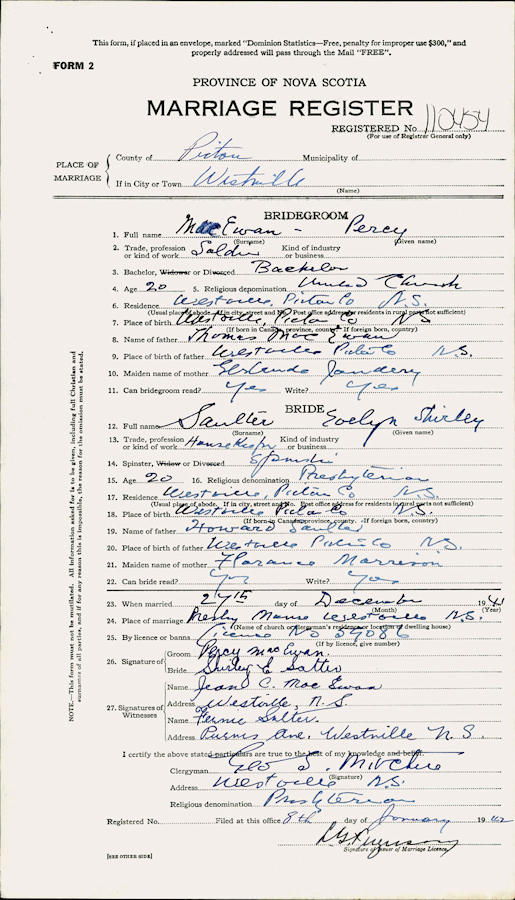 Birth Born on December 01, 1921 in Westville, Pictou Co., NS Death Died on October 12, 2018 in Riverton, Pictou Co., NS Buried in Auburn Cemetery in Westville, Pictou Co., NS Marriages MACEWAN, Percy Married on December 27, 1941 in Westville, Pictou Co., NS Children MACEWAN, Trudy MACEWAN, Percy: October 07, 1946 - December 12, 2007 Notes Obituary: E. Shirley MacEwan, 96 of Westville passed on Friday, October 12, 2018 in Valley View Villa. Born in Westville, she was a daughter of the late Howard and Florence (Morrison)) Salter. A lifelong resident of Westville, Shirley was a member of the Eastern Star Lodge for over 60 years holding many offices. In her earlier years, she was active in St. Andrews Presbyterian Church, the Westville Heritage Club and the Westville Curling Club. She will be dearly missed by her daughter Trudy Taylor (Fred); very special niece Katherine Saunders; 3 grand children and 5 great grand children. Shirley was predeceased by her husband Percy; son Percy "Spike" MacEwan; sister Ivy Stewart and brothers Bruce, John, Max, and Fernie Salter. Thank you to the Staff of Valley View Villa or the care given to Shirley. A grave side service was held 1:30pm Tuesday, October 16 at the Auburn Cemetery, Westville, with Rev. Greg Dickson officiating. Donations in her memory may be made to Valley View Villa or a charity of one's choice. Sources Funeral Home: Eagles Funeral Home Westville,NS Obituary October 2018 Images Shirley Salter Birth Percy & Evelyn(Salter) MacEwan & Percy & Jane (MacKean) MacEwan Percy MacEwan Marriage Evelyn Salter