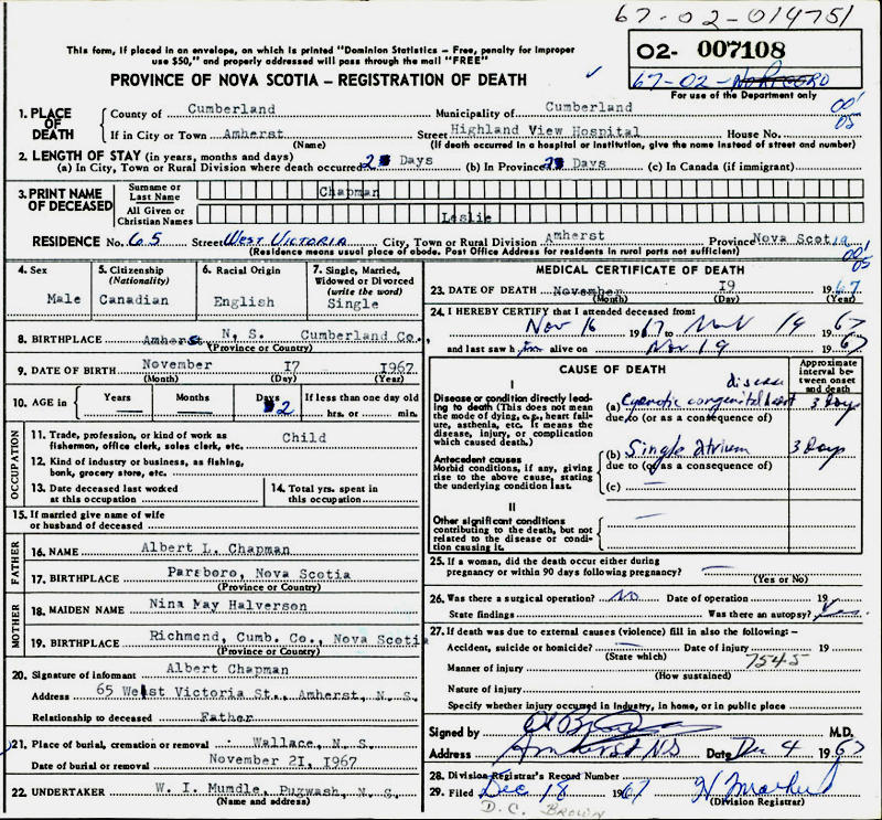 Parents Father: CHAPMAN, Albert Leslie Mother: HALVERSON, Nina Mae Birth Born on November 17, 1967 in Amherst, Cumberland Co., NS Death Died on November 19, 1967 in Amherst, Cumberland Co., NS Notes Death: Cyanolic Congestive Heart Failure Sources Nova Scotia Deaths: Year 1967 #7108 Images Leslie Chapman Death