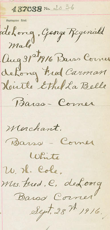 Parents Father: DELONG, Fred Carmen Mother: HIRTLE, Ethel Celeste Labelle Birth Born on August 31, 1916 in Barss Corner, Lunenburg Co., NS Death Died on March 30, 1993 in Barss Corner, Lunenburg Co., NS Buried in Barss Corner Community Cemetery in Barss Corner, Lunenburg Co., NS Marriages MOORE, Hazel Virginia Married on November 30, 1951 Children DELONG, George William: 1954 DELONG, Jane Elizabeth: 1954 DELONG, Burpee Carmen: 1956 Notes Obituary: 1993 Halifax Herald George R. DeLong, 76, Barss Corner, Lunenburg County, died March 30, 1993, at home. Born in Barss Corner, he was a son of the late Fred and Ethel (Hirtle) DeLong. He was an avid sportsman and a life member of Nova Scotia Guides Association; member of Epworth United Church, New Germany. He served in the Forestry Corps during the Second World War and later as a flying officer. He was a POW in Germany when the war ended. He was owner of George R. DeLong Hardware and Feed for 16 years. He is survived by his wife, the former Hazel Moore; daughter, Jane Marshall, Watford; two sons, George, Jr., Beech Meadows, Queens County; Burpee, Lower Sackville; sister, Judith (Mrs. John Mader), Barss Corner; brother, Fred, Barss Corner; seven grandchildren; several nieces and nephews. He was predeceased by a brother, Carmen. The body is in New Germany Funeral Home, visiting 2-4, 7-9 p.m. today. Funeral will be 2 p.m. Friday in Epworth United Church, New Germany, Rev. Grant Walls officiating, assisted by Rev. Karl and Miriam Uhrstrom. Burial will be in Barss Corner Community Cemetery. In lieu of flowers, donations may be made to any charity. Occupation: Merchant Military Service: WW2 RCAF Sources Findagrave.com: https://www.findagrave.com/memorial/98148093/george-reginald-delong Images George DeLong Birth George & Hazel (Moore) DeLong George DeLong