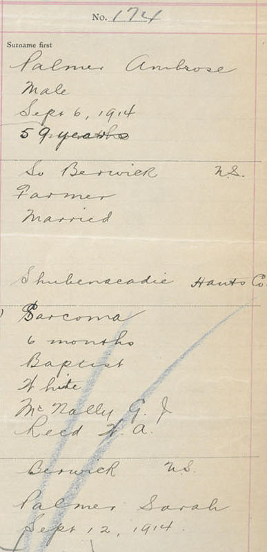Parents Father: PALMER, Thomas Richard Mother: NICHOLS, Margaret Ann Birth Born on March 05, 1855 in Shubenacadie, Hants Co., NS Death Died on September 06, 1914 in South Berwick, Kings Co., NS Buried in Berwick Cemetery in Berwick, Kings Co., NS Marriages CHUTE, Sarah Married on February 25, 1882 in Lowell, Middlesex Co., MA Children PALMER, Alexander Selfridge: November 16, 1896 - 1983 PALMER, Alice Rebecca: October 18, 1906 Notes Occupation: Teamster/ Farmer Death: Carcinoma Sources Berwick Register: September 16, 1914 Nova Scotia Deaths: Book 40 Pg. 47 #174 Images Ambrose & Sarah (Chute) Palmer Ambrose Palmer Death Ambrose Palmer Marriage