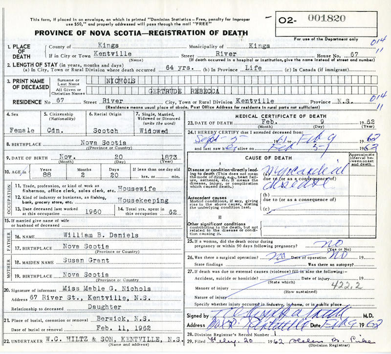 Parents Father: DANIELS, William Burton Mother: GRANT, Susannah Birth Born on November 20, 1873 in Lawrencetown, Annapolis Co., NS Death Died on February 09, 1962 in Kentville, Kings Co., NS Buried in Berwick Cemetery in Berwick, Kings Co., NS Marriages NICHOLS, George Addy Married on September 14, 1898 in Lawrencetown, Annapolis Co., NS Children NICHOLS, Mabel Gertrude: October 23, 1900 - August 07, 1996 NICHOLS, Coy Addy: May 21, 1903 - August 21, 1930 NICHOLS, Clyde Maxwell: March 19, 1907 - July 05, 1994 NICHOLS, Joyce Freeman: February 21, 1918 - June 01, 1999 Notes Death: Myocardial Disease Marriage Notice: Berwick Register, Sept.21,1898: A very pretty wedding took place on Wednesday morning, Sept. 14th, at the house of Burton Daniels, Lawrencetown. The principals in the event were Addy G. Nichols, the popular conductor of the D.A.R. and Miss Gertrude Daniels. The bride was attired in a handsome popline gown, wore orange blossoms and carried a bouquet of beautiful white flowers. She was attended by Miss Blanche Charlton. Mr. Roop acted as groomsman. The wedding party marched in to the strains of Mendelsshon's Wedding March and took their places beneath an arch of flowers and autumn leaves. The ceremony was performed by Rev.L.F. Wallace, B.A. After congratulations had been received, a wedding breakfast was served, the happy couple took conveyances for the railway station, where they boarded the express for St.John. They will, on their return, reside in Kentville. The bride was the recipient of many presents, among them being a gold watch and chain, the gift of the groom. Sources Nova Scotia Deaths: Year 1962 Pg. 1820 Images George A. & Gertrude (Daniels) & Coy & Mabel Nichols Gertrude (Daniels) Nichols Death