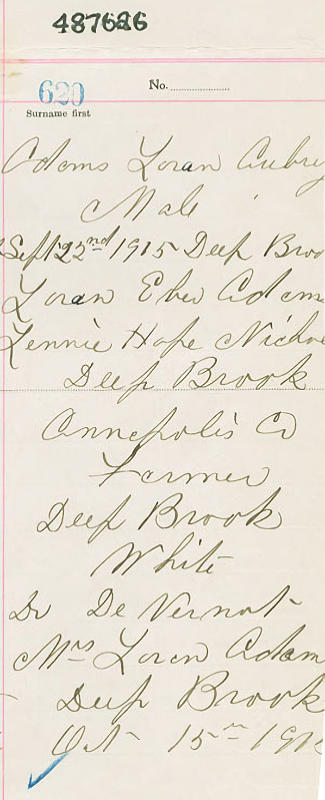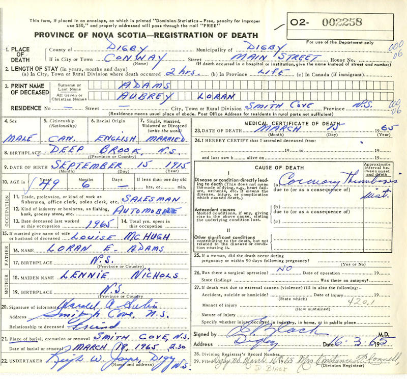 Parents Father: ADAMS, Loran Eber Mother: NICHOLS, Lennie Hope Birth Born on September 22, 1915 in Deep Brook, Annapolis Co., NS Death Died on March 15, 1965 in Conway, Digby Co., NS Buried in Smith-Sulis Cemetery in Smiths Cove, Digby Co., NS Marriages McHUGH, Margaret Louise Married on June 07, 1941 in Clementsport, Annapolis Co., NS Children ADAMS, Wendy Notes Occupation: Automobile Salesman Death: Coronary Thrombosis Sources Nova Scotia Deaths: Year 1965 Pg. 2258 Images Aubrey Adams Birth Aubrey & Margaret (McHugh) Adams Aubrey Adams Death Aubrey Adams Marriage