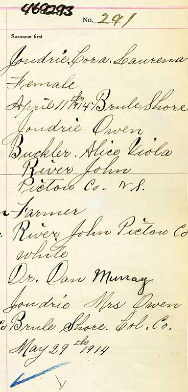 Parents Father: JOUDRIE, Owen Mother: BUCKLER, Alice Viola Birth Born on April 11, 1914 in Brule Shore, Colchester Co., NS Death Died on January 17, 1997 in Truro, Colchester Co., NS Buried in Bible Hill Cemetery in Bible Hill, Colchester Co., NS Marriages PRYOR, Leonard Harry Married on May 31, 1937 in New Glasgow, Pictou Co., NS Children PRYOR, Carl Donald: December 25, 1942 - March 27, 2020 Images Cora Joudrie Birth Leonard & Cora (Joudrie) Pryor Cora Joudrie Marriage