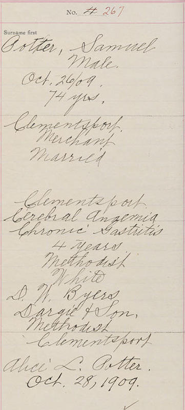 Parents Father: POTTER, John Mother: BALCOMB, Mary Birth Born on December 08, 1835 in Clementsport, Annapolis Co., NS Death Died on October 26, 1909 in Clementsport, Annapolis Co., NS Buried in United Church of Canada Graveyard in Clementsport, Annapolis Co., NS Marriages POTTER, Alice Loretta (Woodbury) Married on 1879 in Annapolis Co., NS Notes Occupation: Merchant Death: Cerebral anemia/ Chronic Gastritis Sources Nova Scotia Deaths: Book 1 Pg. 45 #267 Images Samuel Potter & Alice (Potter) Margeson Samuel Potter Death Samuel Potter Marriage