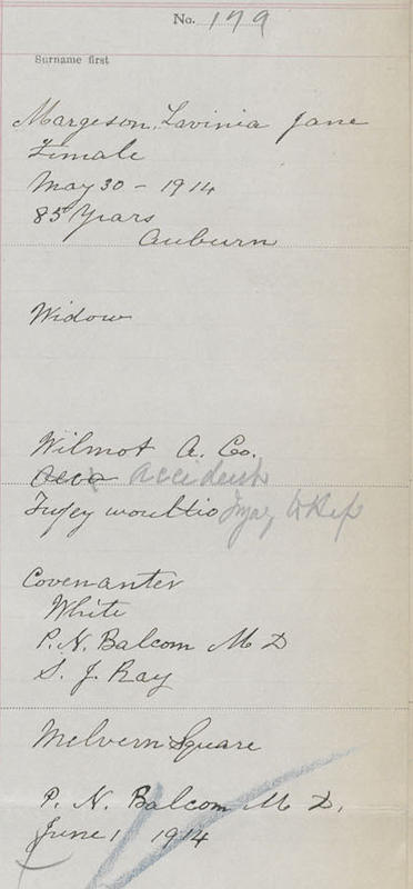 Birth Born on September 10, 1828 in Wilmot, Annapolis Co., NS Death Died on May 30, 1914 in Auburn, Kings Co., NS Buried in Melvern Square, Annapolis Co., NS Marriages MARGESON, Thomas Ansley Married on April 08, 1857 in Wilmot, Annapolis Co., NS Children MARGESON, Susan Arabella: April 30, 1859 - May 19, 1930 MARGESON, George E.: September 10, 1861 - September 11, 1861 MARGESON, Elizabeth Lavinia: September 11, 1862 - June 29, 1904 MARGESON, Annie Outhit: August 23, 1866 - September 30, 1947 MARGESON, Georgetta Helena: October 12, 1868 - October 22, 1953 Notes Death: Accident Sources Nova Scotia Deaths: Book 40 Pg. 49 #179 Images Lavinia (Outhit) Margeson Death