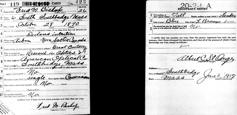 Parents Father: BISHOP, James Spurgeon Mother: MARGESON, Susan Arabella Birth Born on October 28, 1890 in Auburn, Kings Co., NS Death Died on February 03, 1979 in Baltimore, MD Marriages COMMON, Elizabeth Grace Married on June 21, 1920 in Lowell, Middlesex Co., MA Children BISHOP, Anne: September 07, 1922 - September 16, 2017 BISHOP, Cecily: December 22, 1924 - January 20, 2018 Notes Occupation: Research in Optics American Optical Co./ Physicist Eastman-Kodak Co. Sources Mormons: https://www.familysearch.org/en/tree/person/details/L8YT-1KG Images Fred Bishop WW1 Draft Fred Bishop WW2 Draft Fred Bishop Marriage Fred Bishop