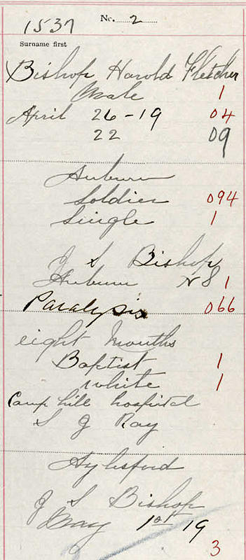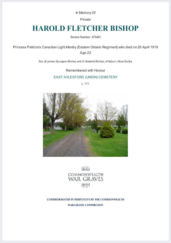 Parents Father: BISHOP, James Spurgeon Mother: MARGESON, Susan Arabella Birth Born on August 09, 1896 in Auburn, Kings Co., NS Death Died on April 26, 1919 in Halifax, Halifax Regional Municipality, NS Buried in Aylesford Union Cemetery in Aylesford, Kings Co., NS Notes Military Service: WW1 Canadian Expedition Force Death: Paralysis Sources Nova Scotia Deaths: Book 40 Pg. 511 #1537 Images Harold Bishop Death Harold Bishop WW1 Commemoration
