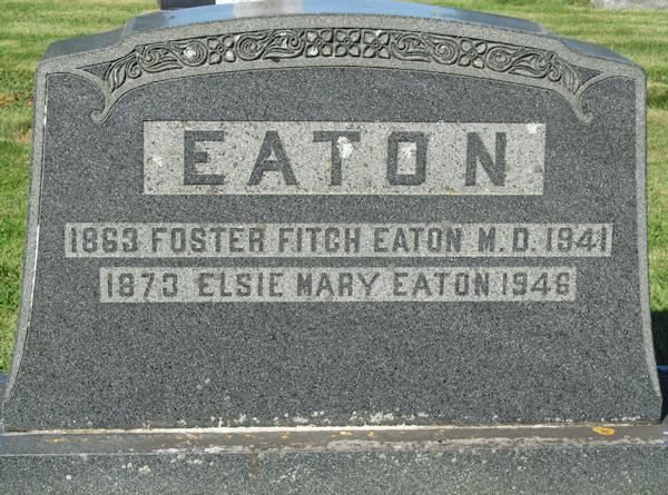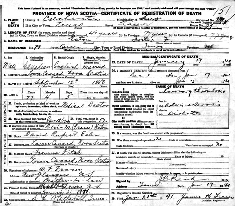 Birth Born on September 12, 1863 in Lower Canard, Kings Co., NS Death Died on January 17, 1941 in Truro, Colchester Co., NS Buried in Robie St. Cemetery in Truro, Colchester Co., NS Marriages MARGESON, Elizabeth Lavinia Married on June 11, 1890 in Margaretsville, Annapolis Co., NS Children EATON, Carl Margeson: June 20, 1891 - November 04, 1961 EATON, Marjorie Outhit: April 27, 1895 - July 10, 1969 EATON, Horace Mann: May 15, 1899 - 1985 EATON, George Outhit: June 21, 1901 - December 11, 1975 EATON, Hugh MacDonald: September 12, 1902 - January 12, 1969 Notes Occupation: Physician Death: Coronary Thrombsis Sources Nova Scotia Deaths: Year 1941 File 196 #151 Images Foster Eaton Foster Eaton Death Elizabeth Margeson Marriage