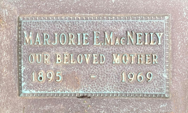 Parents Father: EATON, Foster Fitch Mother: MARGESON, Elizabeth Lavinia Birth Born on April 27, 1895 in Rose Bay, Lunenburg Co., NS Death Died on July 10, 1969 in New Westminister, Metro Vancouver Region, BC Buried in Ocean View Burial Park in Burnaby, Metro Vancouver Region, BC Marriages MACNEILY, William Henry Married on August 23, 1922 in Truro, Colchester Co., NS Children MACNEILY, Malcolm Gates: May 01, 1924 - November 30, 1982 MACNEILY, Jack Eaton: January 22, 1927 - April 11, 1960 MACNEILY, Murray Margeson: September 11, 1931 - 1991 MACNEILY, Kathleen Outhit: 1934 Notes Occupation: Registered Nurse Death: Arteriosclerotic Heart Disease Sources BC Deaths: 69-09-011841 Images Marjorie Eaton Birth Marjorie (Eaton) MacNeily Marjorie Eaton Marriage