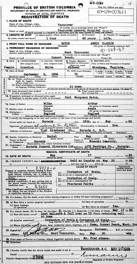 Birth Born on September 06, 1896 in Winnipeg, Winnipeg Capital Region, MB Death Died on May 17, 1969 in Vancouver, Metro Vancouver Region, BC Buried in Masonic Cemetery in Burnaby, Metro Vancouver Region, BC Marriages EATON, Carl Margeson Married on September 16, 1920 in Vancouver, Metro Vancouver Region, BC Children EATON, Frederick M.: 1929 Notes Occupation: Teacher Death: Contusion of Brain/ Fractured Pelvis Fell over a 10 foot wall at home Sources BC Deaths: 69-09-007611 Images Carl & Annie (Wilks) Eaton Annie (Wilks) Eaton Death Carl Eaton Marriage