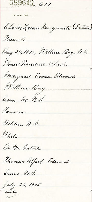 Birth Born on August 20, 1896 in Wallace Bay, Cumberland Co., NS Death Died on August 21, 1995 in Bellingham, Norfolk Co., MA Marriages EATON, Horace Mann Married on July 05, 1922 in Pugwash, Cumberland Co., NS Children EATON, June Clark: June 06, 1924 - August 26, 2011 EATON, Virginia Margeson: October 19, 1925 - December 05, 2021 EATON, Horace Foster: August 25, 1927 - January 13, 2013 EATON, Shirley Anne: November 06, 1934 Images Laura Clark Birth Horace Eaton Marriage