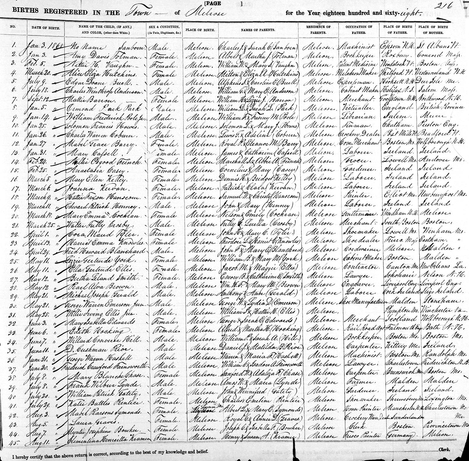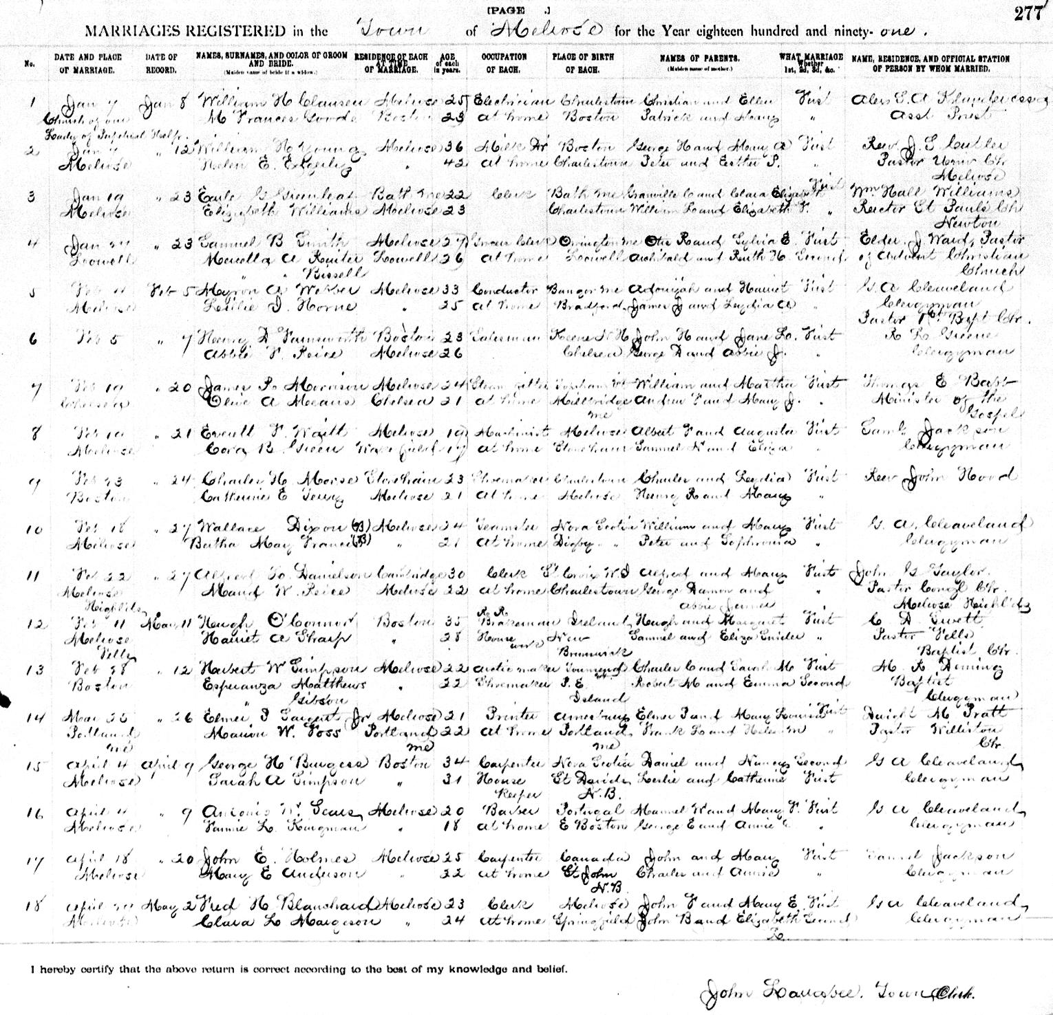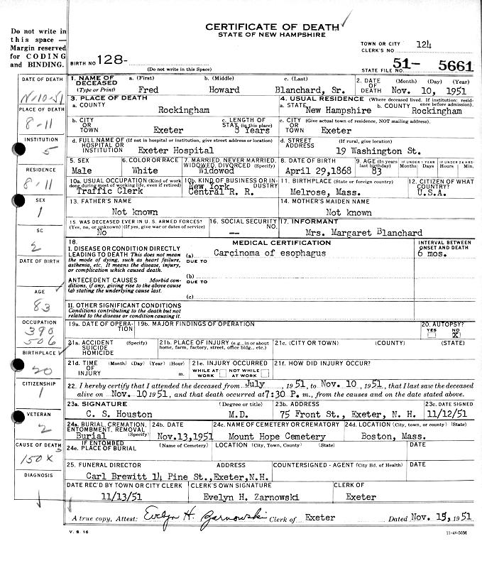 Birth Born on April 29, 1868 in Melrose, Middlesex Co., MA Death Died on November 10, 1951 in Exeter, Rockingham Co., NH Buried in Mount Hope Cemetery in Boston, Suffolk Co., MA Marriages MARGESON, Clara L. Married on April 20, 1891 in Melrose, Middlesex Co., MA Children BLANCHARD, Hazel Arline: February 16, 1892 - 1920 BLANCHARD, Ernest John: March 12, 1895 - June 10, 1959 BLANCHARD, Fred Howard: February 20, 1897 - October 13, 1960 Notes Occupation: Clerk/ Traffic Clerk New York Central RR Death: Carcinoma of Esophagus Sources New Hampshire Deaths: #51-5661 Images Fred Blanchard Birth Fred Blanchard Death Clara Margeson Marriage
