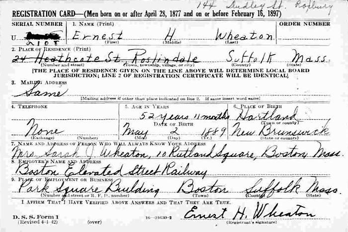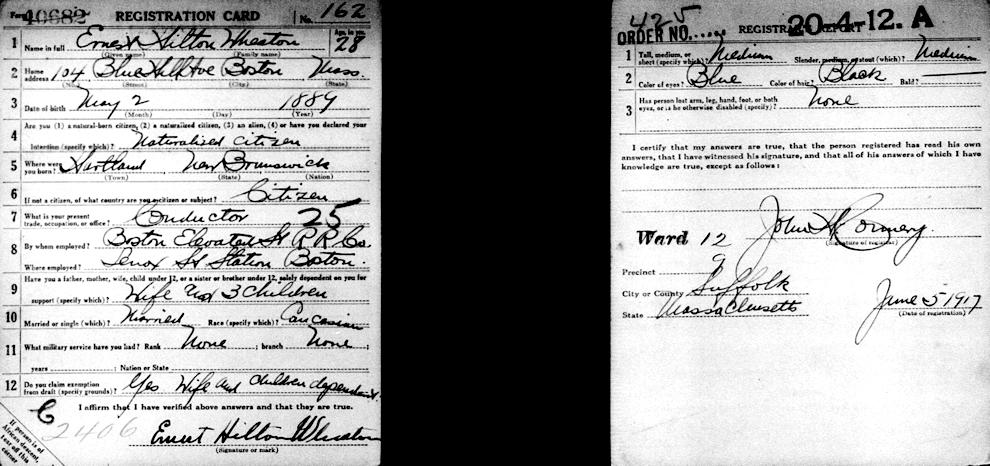 Birth Born on May 02, 1889 in Hartland, Carleton Co., NB Death Died on February 23, 1955 in Boston, Suffolk Co., MA Marriages BLANCHARD, Hazel Arline Married on January 25, 1909 in Providence, Providence Co., RI Children WHEATON, Boy: May 10, 1909 - May 12, 1909 WHEATON, Doris Ernestine: November 25, 1910 - October 24, 1984 WHEATON, Mildred Arline: June 03, 1914 - October 22, 1991 WHEATON, Eleanor Augusta: July 21, 1915 - 1956 WHEATON, Ralph Howard: March 06, 1919 - May 24, 1986 Notes Occupation: Printer/ Conductor Boston Elevated RR Sources Newspaper Obituary: Boston Herald Boston,MA February 24,1955 Images Ernest Wheaton WW1 Draft Ernest Wheaton WW2 Draft Hazel Blanchard Marriage