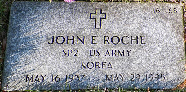 Parents Father: ROCHE, John Francis Mother: WHEATON, Mildred Arline Birth Born on May 16, 1937 in Boston, Suffolk Co., MA Death Died on May 29, 1995 in Bourne, Barnstable Co., MA Buried in Massachusetts National Cemetery in Bourne, Barnstable Co., MA Marriages SHARPE, Anna T. Children ROCHE, John Ernest: April 25, 1963 - April 27, 2000 Notes Military Service: Korea US Army Sources Massachusetts Deaths: #035085 Images John E. Roche