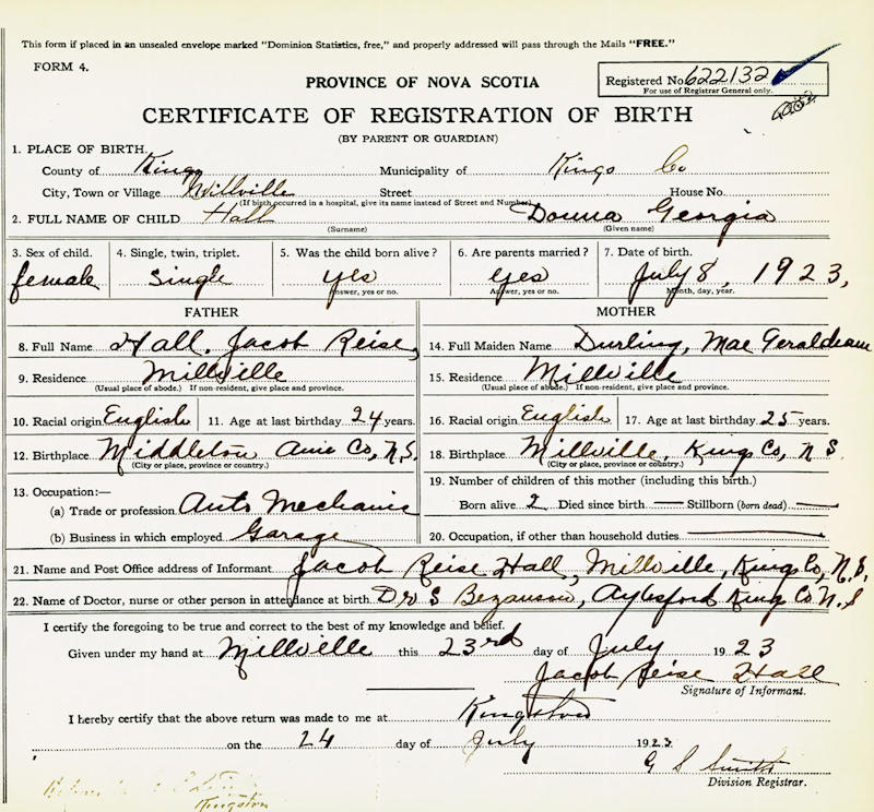 Birth Born on July 08, 1923 in Millville, Kings Co., NS Marriages THOMAS, Manson Lysander Married on August 09, 1941 in Berwick, Kings Co., NS Notes Occupation: Retail Clerk Images Donna Hall Birth Manson Thomas Marriage