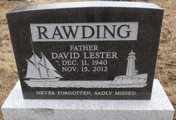 Parents Father: RAWDING, Lester Gerald Mother: THOMAS, Reta Victoria Birth Born on December 11, 1940 in Berwick, Kings Co., NS Death Died on November 12, 2012 in Kentville, Kings Co., NS Buried in Berwick Cemetery in Berwick, Kings Co., NS Marriages BLITH, Carol Children RAWDING, Leslie RAWDING, Angela RAWDING, Michael A.: November 28, 1965 - November 28, 1984 Notes Occupation: Machine Operator/ Truck Driver Obituary: RAWDING, David Lester \endash 71, Somerset passed away November 15, 2012 at the Valley Regional Hospital, Kentville as the result of many health issues. Born in Berwick, he was the son of the late Reta (Thomas) Sawlor and the late Lester Rawding. David was a machine operator and long distance trucker for many years and always had a dog as his favorite companion. David enjoyed fishing, drives to the shore and was an active member of the "Tim Horton's Morning Club, Berwick". David is survived by son, Leslie (Cindy) Rawding, Black Rock; daughter, Angela Rawding, Halls Harbour; granddaughters, Danielle (Chad) Rawding, Fort McMurray and Alysia Rawding, Harmony; sisters, Beverly, Somerset, Heather, Kingston; brother Kim, Weston; several nieces and nephews. Besides his parents David was predeceased by son, Michael Rawding; granddaughter Ashley Dawne Rawding. Cremation has taken place. A private family graveside service will be held at a later date in the Berwick Cemetery. In lieu of flowers, donations may be made to the Canadian Cancer Society or The Heart and Stroke Foundation of Nova Scotia. Sources Funeral Home: H.C. Lindsay Funeral Home Berwick,NS Obituary November 15,2012 Images David Rawding