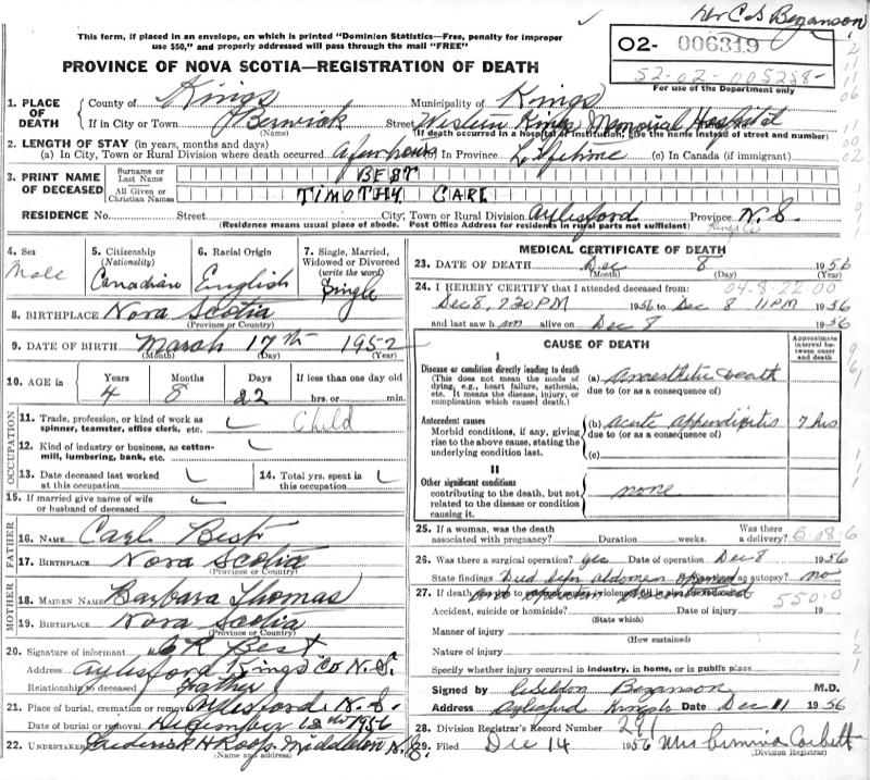 Parents Father: BEST, Carl Reginald Mother: THOMAS, Barbara Ruth Birth Born on March 17, 1952 in Berwick, Kings Co., NS Death Died on December 08, 1956 in Berwick, Kings Co., NS Buried in Union Cemetery in Aylesford, Kings Co., NS Notes Death: Anaesthetic Death Sources Nova Scotia Deaths: Year 1956 #6319 Images Timothy Best Death