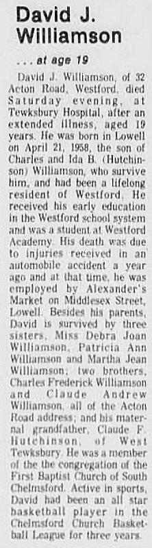 Parents Father: WILLIAMSON, Charles Mother: HUTCHINSON, Ida Baker Birth Born on April 21, 1958 in Lowell, Middlesex Co., MA Death Died on August 13, 1977 in Tewksbury, Middlesex Co., MA Buried in Green Cemetery in Carlisle, Middlesex Co., MA Notes Death: Automobile Accident Injuries Sources Massachusetts Deaths: #038201 Images David Williamson Obit Lowell Sun Lowell,MA Aug 15,1977 David Williamson